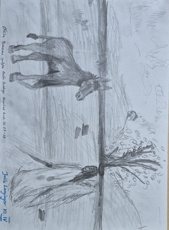 W ramach spotkań z Biblią, nasi uczniowie wykonują ilustrację do usłyszanych historii z Starego i Nowego Testamentu. Poniżej prezentujemy rysunek, który szczególnie nas zachwycił autorstwa Juli Langinger z klasy 4. Praca przedstawia historię Oślicy Balaama zatrzymaną przez Anioła Pańskiego (Ks. Lb 22.27-28).