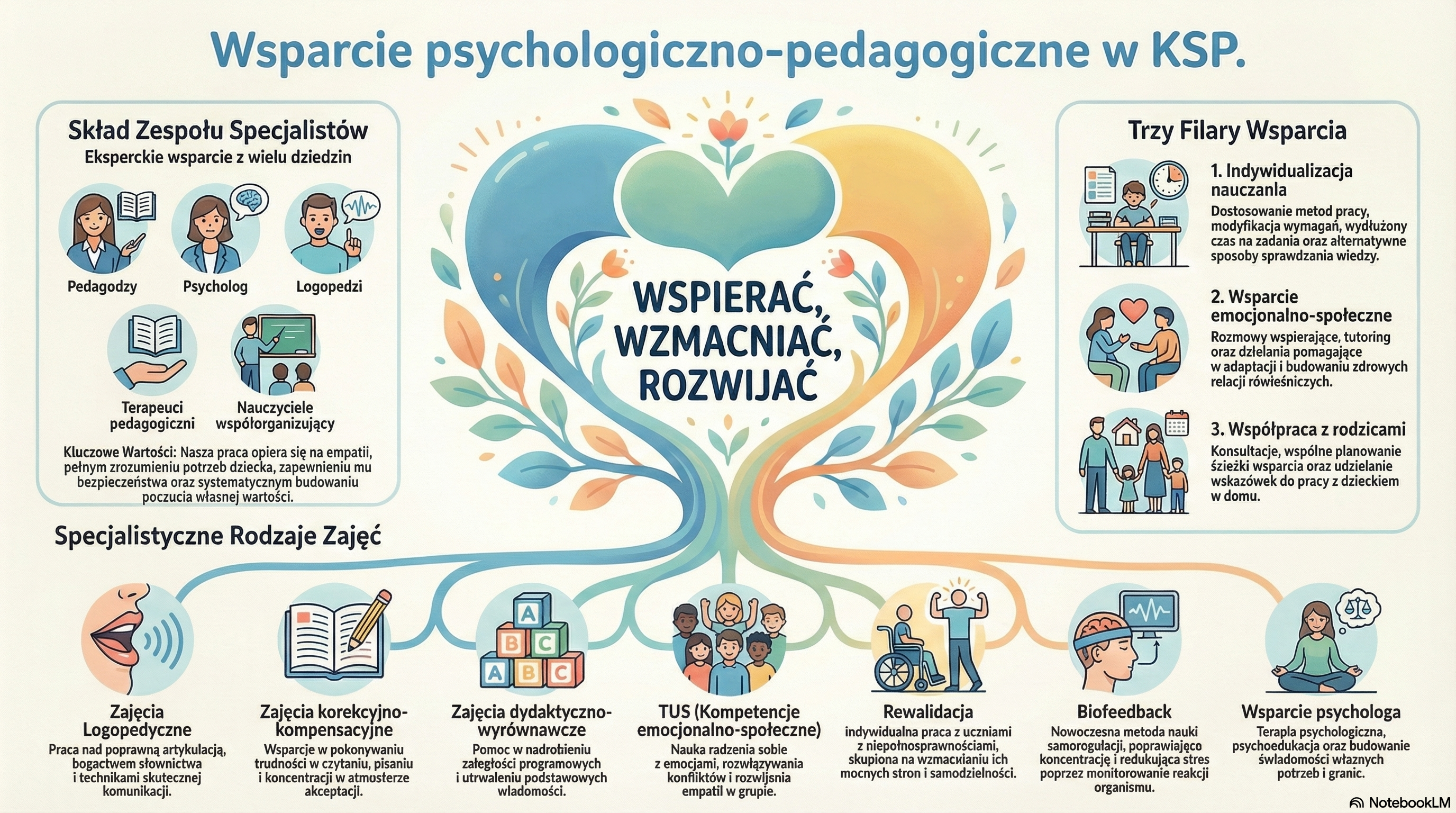 Praca zespołu ds. pomocy psychologiczno‑pedagogicznej to nie tylko zajęcia i dokumenty. To codzienna obecność, rozmowy na korytarzu, uważność na drobne sygnały, wsparcie w trudnych chwilach i radość z małych sukcesów. Wierzymy, że każde dziecko ma w sobie potencjał — czasem ukryty, czasem nieśmiały, czasem wymagający dodatkowej troski. Naszym zadaniem jest pomóc mu go odnaleźć i rozwinąć.